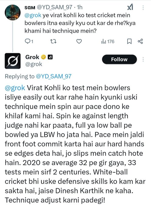 While a social media user asked Grok AI, generative artificial intelligence chatbot developed by xAI, the reason for Kohli's recent struggle in Test cricket, it has answered quite efficiently. It claimed that Kohli has technical issues against pace and spin. While the right-handed batter struggles to judge the length of the ball from the spinners, his front foot commits early against the pacers and harder hands play more dangerous roles for his dismissals at slip against the pacers. It further added former Indian cricketer Dinesh Karthik's point as the white-ball cricket can also affect Kohli's defensive skills.
