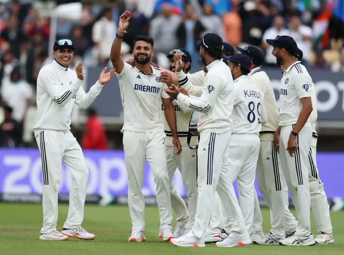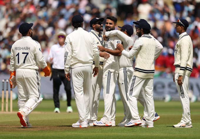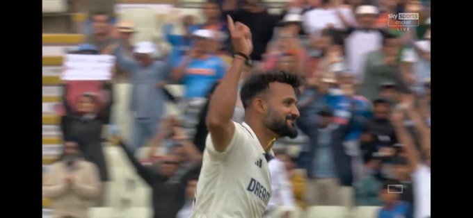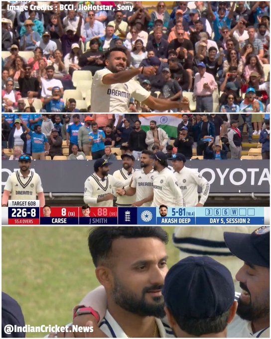 Having already picked up 4 wickets in the first innings, Akash continued his form with another impactful spell in England’s second innings. On the final morning, he made early inroads by dismissing Ollie Pope with a delivery that reared awkwardly and clattered onto the stumps, followed by a sharp in-seamer that trapped Harry Brook plumb in front. His final scalp came when Jamie Smith, who had previously dispatched him for a six, tried to repeat the shot but only found the hands of Washington Sundar at deep square leg.