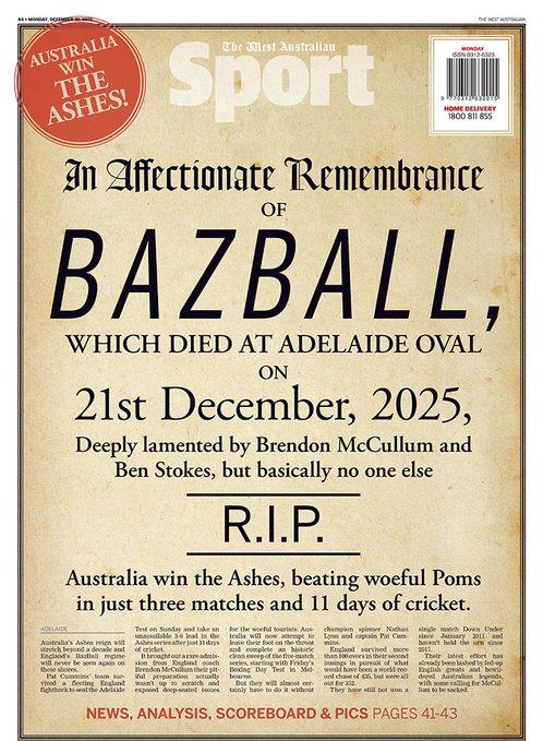 “An affectionate remembrance of Bazball, who died at the Oval on 21st December 2025. Deeply lamented by Brendon McCullum and Ben Stokes, but basically no one else. R.I.P. Australia win the Ashes, beating woeful Poms in just three matches and 11 days of cricket.” The obituary mocked the Bazball in Western Australia.
