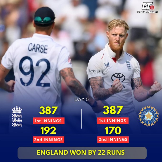 The match was evenly balanced throughout. England won the toss and chose to bat first. They scored 387 runs in their first innings, thanks to Joe Root’s 104 and solid half-centuries from Jamie Smith (51) and Brydon Carse (56). India replied well, also making 387 runs. KL Rahul scored a fine 100, while Rishabh Pant added 74 and Ravindra Jadeja made 72.
