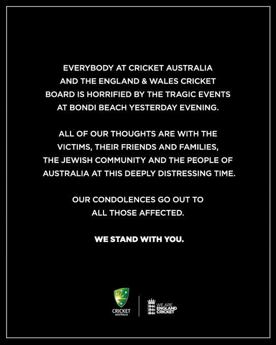 As the focus shifted from cricket to compassion, CA and ECB issued a joint statement condemning the Bondi Beach attack. “Everybody at Cricket Australia and the England and Wales Cricket Board is horrified by the tragic events,” the statement read, extending condolences to the victims, their families and the Jewish community.
