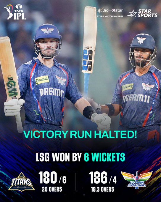 Lucknow Super Giants chased down 181 with three balls to spare, defeating Gujarat Titans by 6 wickets in a thrilling IPL 2025 clash.