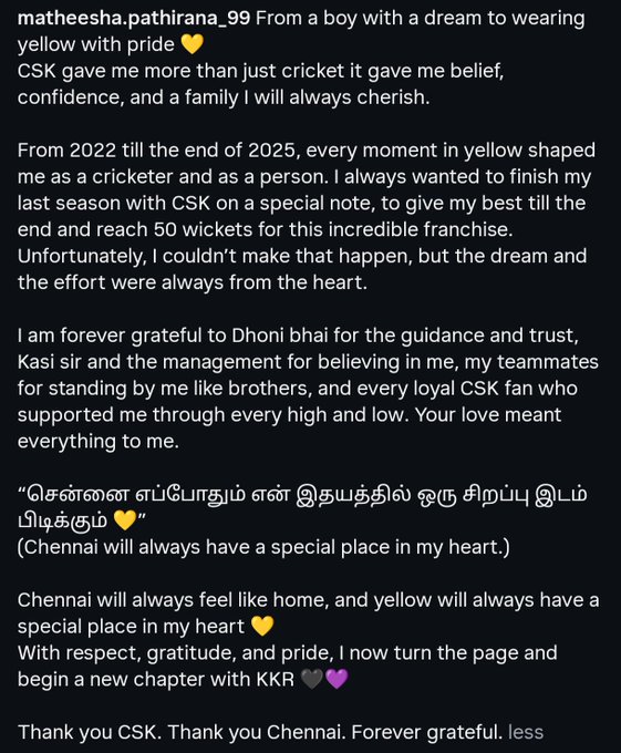 “From a boy with a dream to wearing yellow with pride. CSK gave me more than just cricket, it gave me belief, confidence, and a family I will always cherish,” Pathirana wrote. He added that his time with the franchise from 2022 to 2025 helped him grow not just as a cricketer, but also as a person.