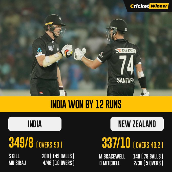 IND vs NZ, 1st ODI: India 349 for 8 (Gill 208, Mitchell 2-30, Shipley 2-74) beat New Zealand 337 (Bracewell 140, Santner 57, Siraj 4-46, Kuldeep 2-43, Thakur 2-54) by 12 runs