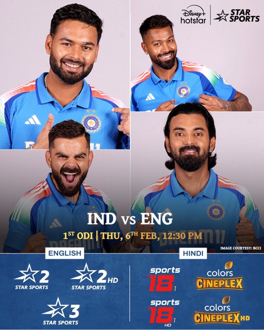 Get all the details on how to watch the India vs England 1st ODI live, including TV channels, online streaming platforms, and free viewing options. Star Sports, Sports 18, Colors Cineplex, and Disney+ Hotstar on February 6 at 12:30 PM IST
