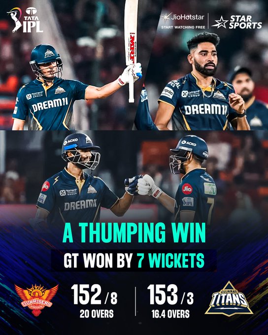 Gujarat Titans defeated Sunrisers Hyderabad by 7 wickets, chasing down 153 with ease thanks to Shubman Gill’s unbeaten 61 and Siraj’s fiery 4/17 spell.