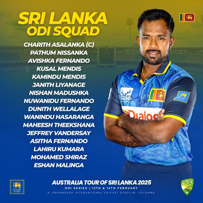 The Sri Lanka Cricket Board has declared the ODI squad for the tour of Australia to Sri Lanka scheduled on 12th and 14th February, 2025. The two-match ODI series will be held at the historic R. Premadasa International Cricket Stadium in Colombo.