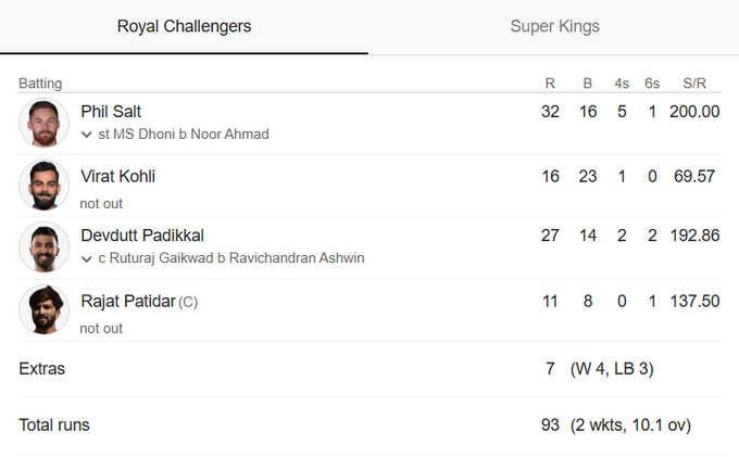 RCB dominated Kolkata Knight Riders in the season-opening match at Eden Gardens, while CSK had started their campaign by beating Mumbai Indians last Sunday.