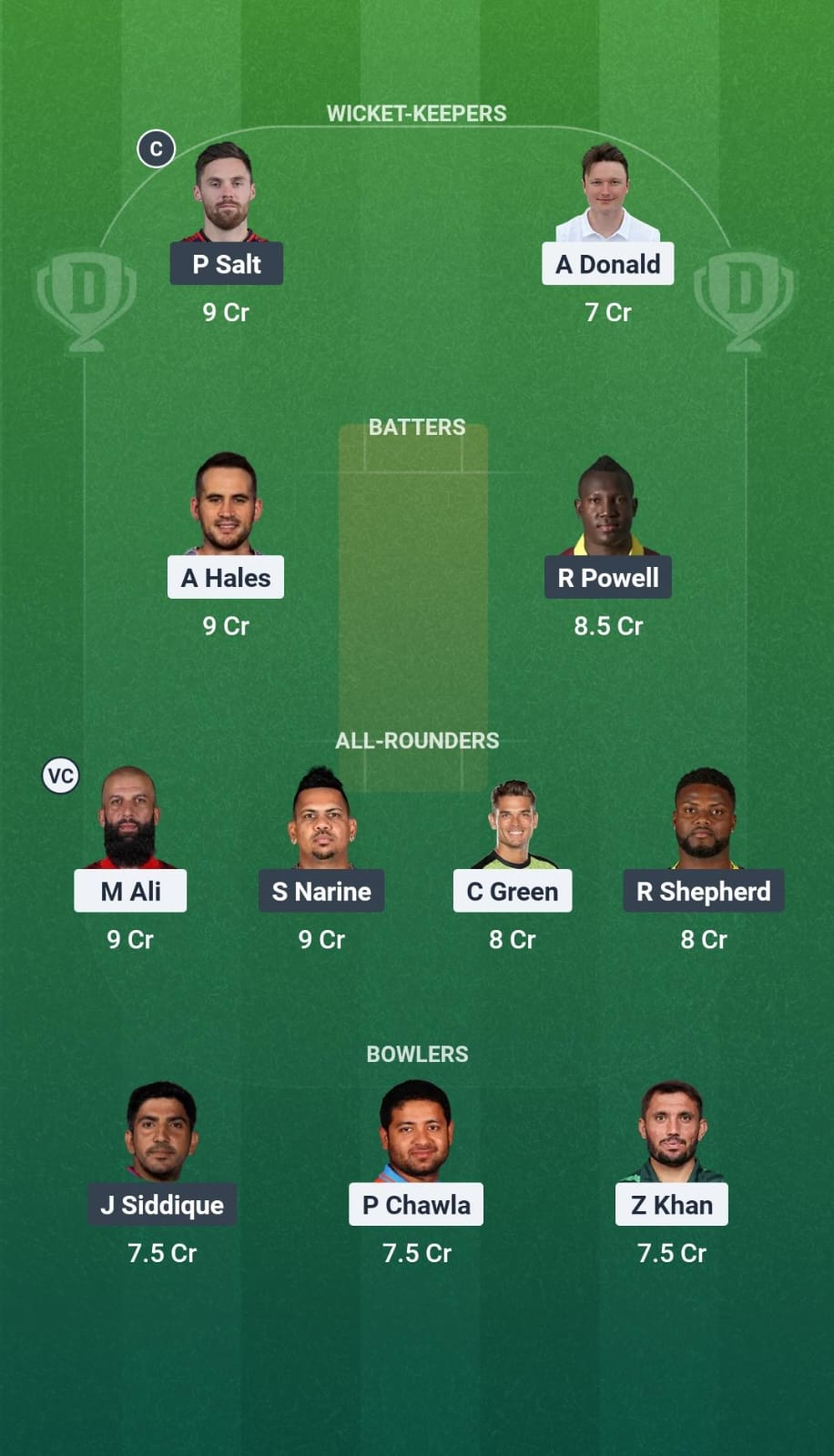 Philip Salt(C), Aneurin Donald, Alex Hales, Rovman Powell, Romario Shepherd, Moeen Ali(VC), Sunil Narine, Chris Green, Zaman Khan, Junaid Siddique, Piyush Chawla