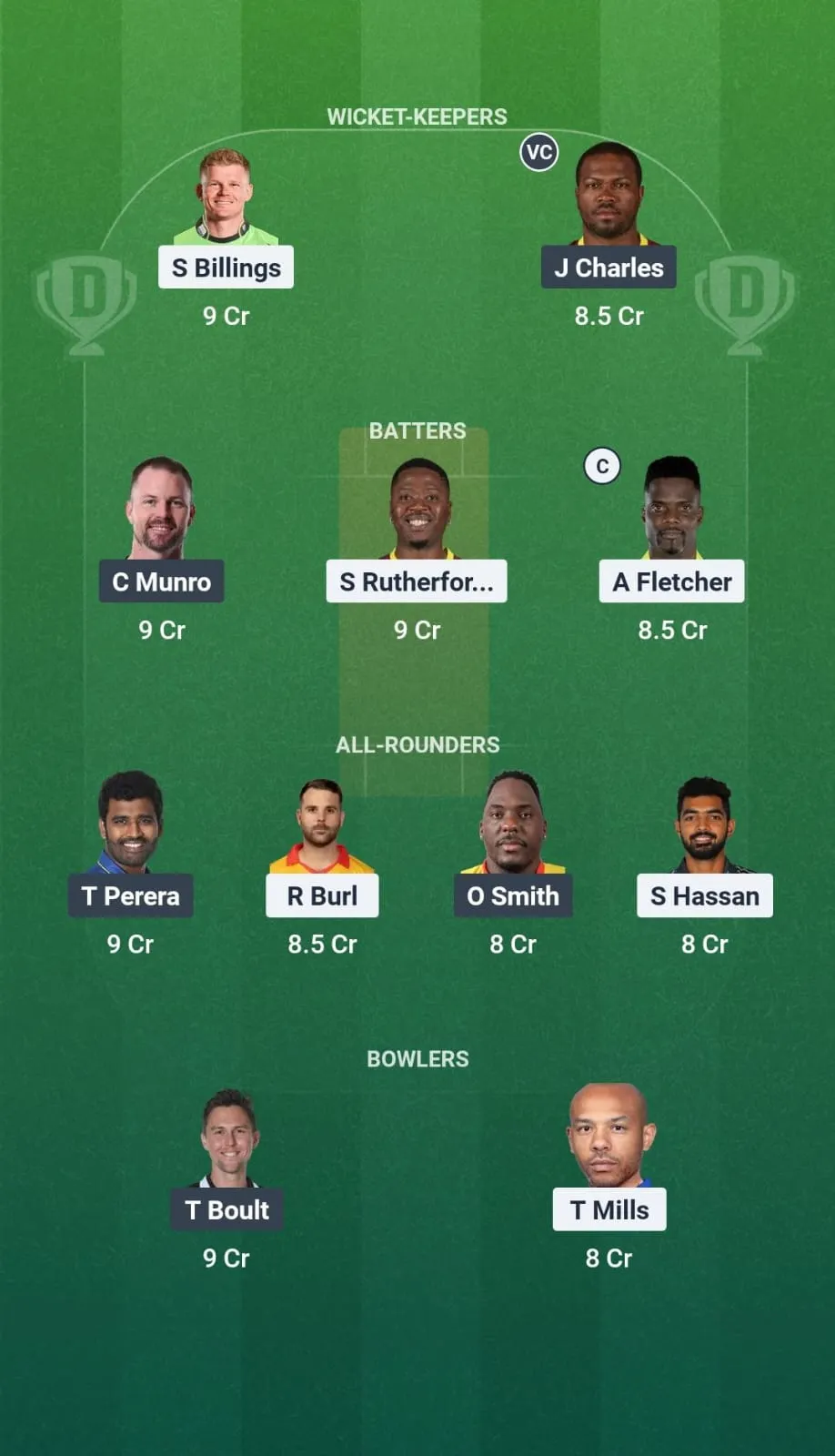 Sam Billings, Johnson Charles(VC), Andre Fletcher(C), Colin Munro, Ben Cutting, Saif Hassan, Avishka Fernando, Thisara Perera, Odean Smith, Tymal Mills, Trent Boult