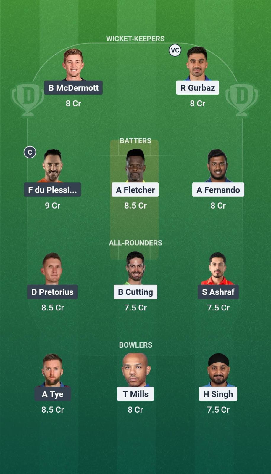 Ben McDermott, Rahmanullah Gurbaz(VC), Faf du Plessis(C), Andre Fletcher, Avishka Fernando, Dwaine Pretorius, Sharafuddin Ashraf, Ben Cutting, Tymal Mills, Andrew Tye, Harbhajan Singh
