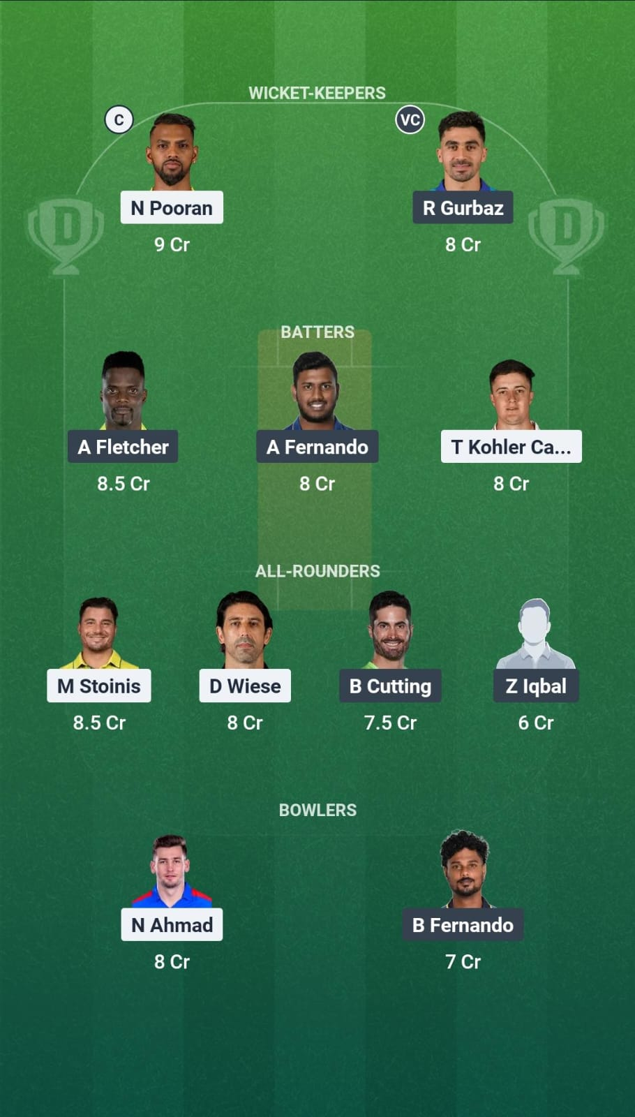 Rahmanullah Gurbaz(VC), Nicholas Pooran(C), Andre Fletcher, Tom Kohler-Cadmore, Avishka Fernando, Marcus Stoinis, David Wiese, Ben Cutting, Zohair Iqbal, Binura Fernando, Noor Ahmad