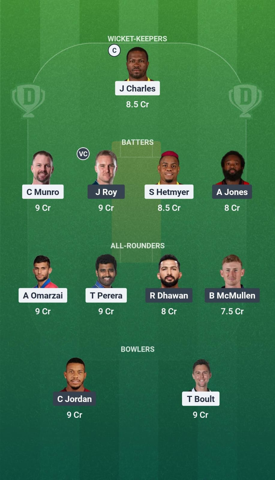 Johnson Charles(C), Colin Munro, Jason Roy(VC), Aaron Jones, Shimron Hetmyer, Thisara Perera, Azmatullah Omarzai, Brandon McMullen, Trent Boult, Rishi Dhawan, Chris Jordan