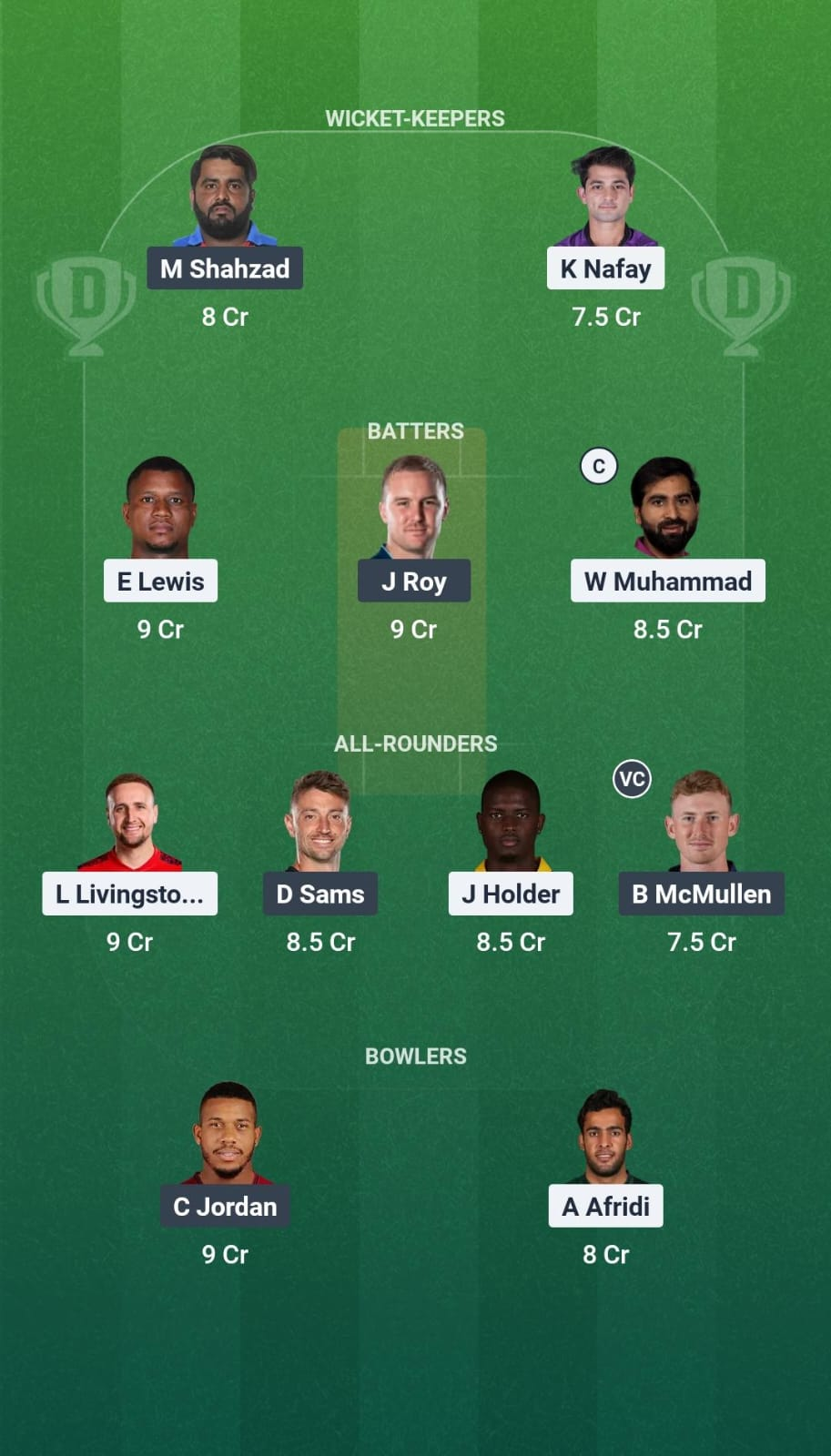 Mohammad Shahzad, Khawaja Nafay, Jason Roy, Evin Lewis, Muhammad Waseem(C), Daniel Sams, Brandon McMullen(VC), Liam Livingstone, Jason Holder, Chris Jordan, Abbas Afridi