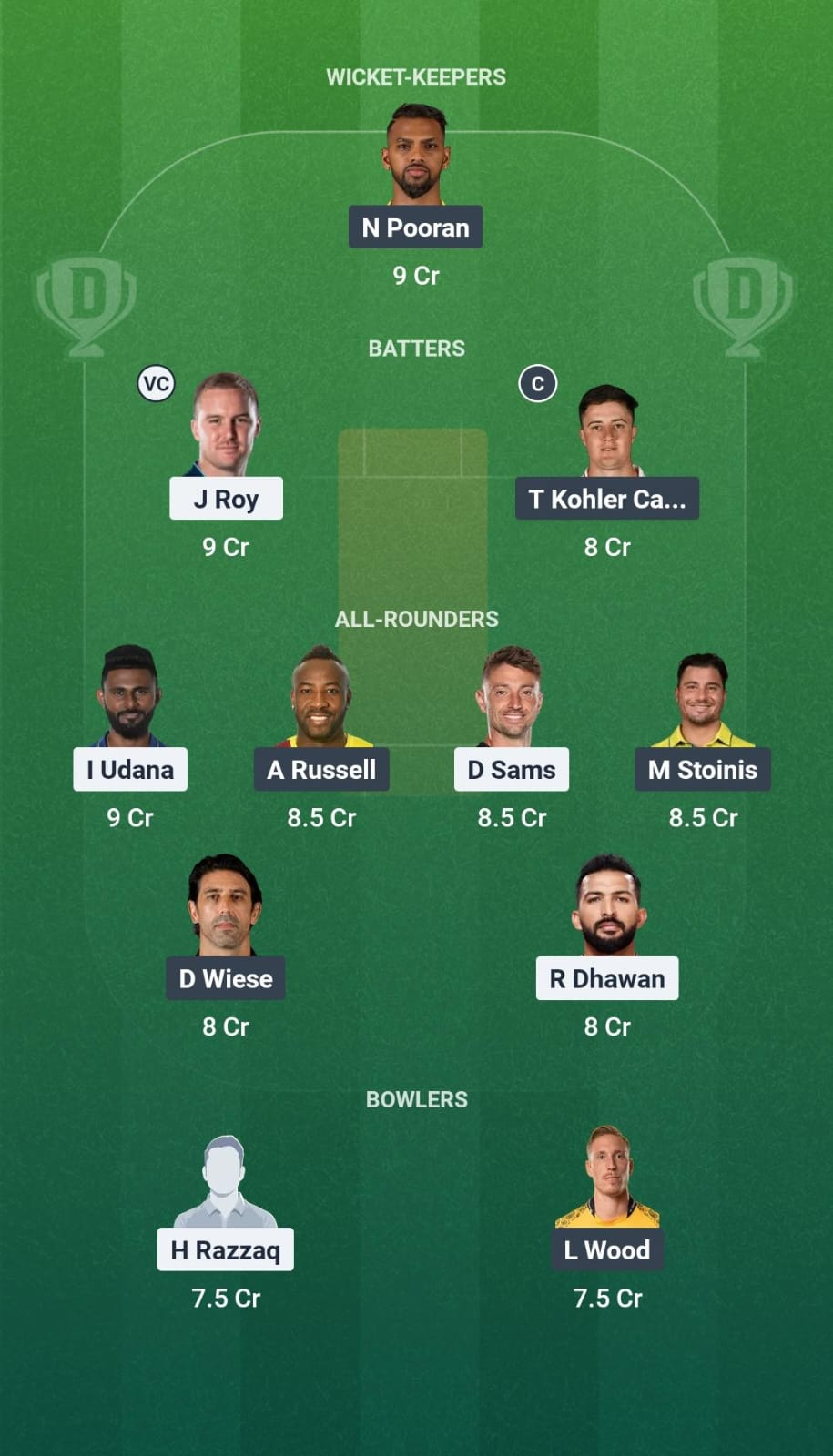 Nicholas Pooran, Tom Kohler-Cadmore(C), Jason Roy(VC), Isuru Udana, Haider Razzaq, David Wiese, Marcus Stoinis, Rishi Dhawan, Andre Russell, Luke Wood, Daniel Sams