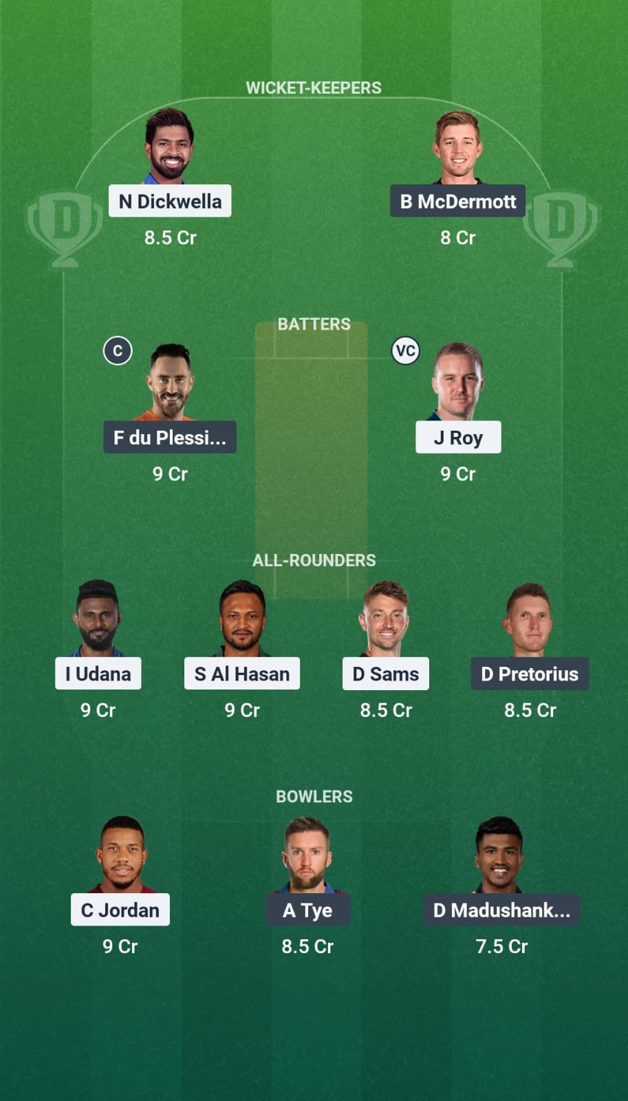 Niroshan Dickwella, Jason Roy(VC), Ben McDermott, Faf du Plessis(C), Shakib Al Hasan, Daniel Sams, Dwaine Pretorius, Isuru Udana, Chris Jordan, Andrew Tye, Dilshan Madushanka