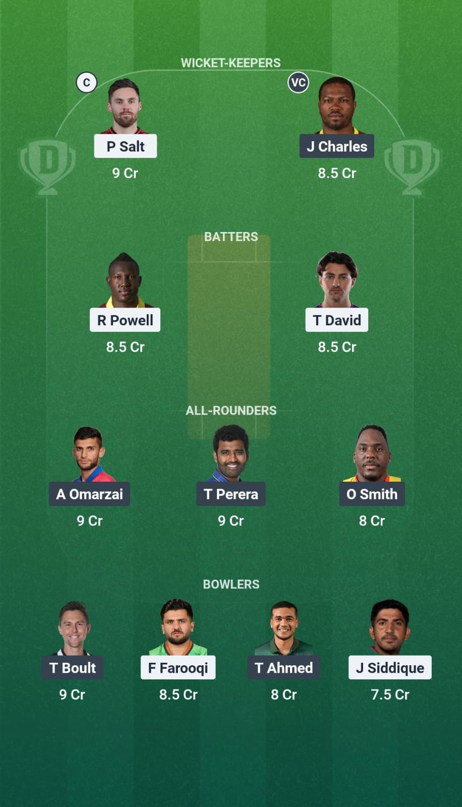 Hazratullah Zazai, Johnson Charles(wk), Dinesh Chandimal, Shimron Hetmyer, Thisara Perera(c), Azmatullah Omarzai, Odean Smith, Shahid Iqbal Bhutta, Muhammad Uzair Khan, Trent Boult, Taskin Ahmed Impact Subs: Colin Munro, Shahnawaz Dahani, Tabraiz Shamsi