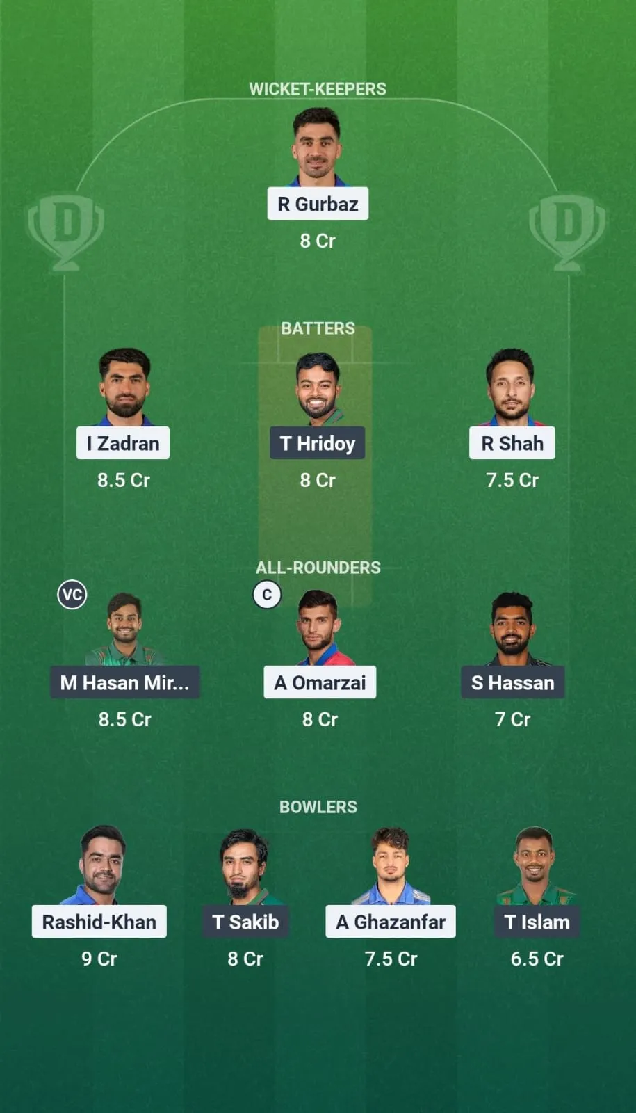 Rahmanullah Gurbaz, Ibrahim Zadran, Rahmat Shah, Towhid Hridoy, Mehidy Hasan Miraz(VC), Azmatullah Omarzai(C), Saif Hassan, Rashid Khan, AM Ghazanfar, Tanzim Hasan Sakib, Tanvir Islam