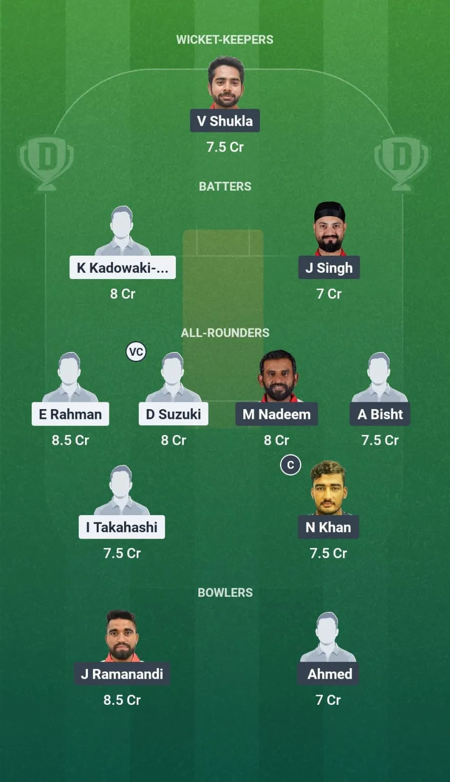 Vinayak Shukla, Jatinder Singh, Kendel Fleming, Mohammad Nadeem, Eesam Rahman, Nadeem Khan(C), Declan Suzuki(VC), Aryan Bisht, Jiten Ramanandi, Ibrahim Takahashi, Shakeel Ahmed