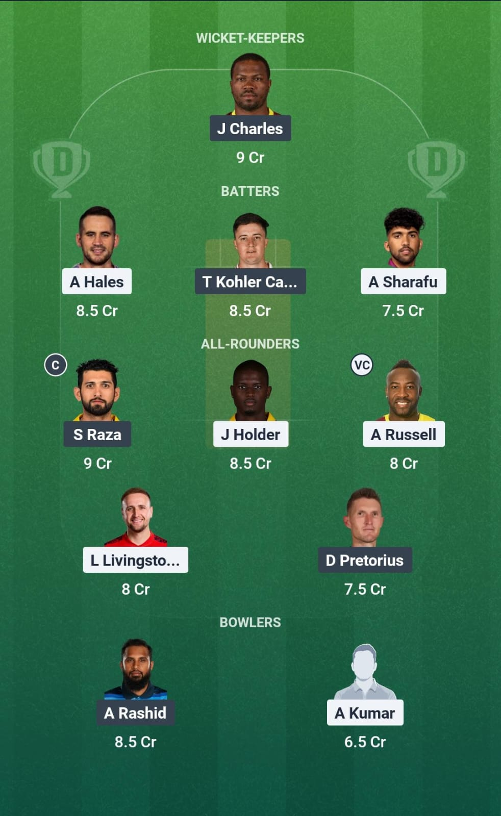 Johnson Charles, Tom Kohler-Cadmore, Alishan Sharafu, Alex Hales, Liam Livingstone, Sikandar Raza(C), Dwaine Pretorius, Jason Holder, Andre Russell(VC), Adil Rashid, Ajay Kumar