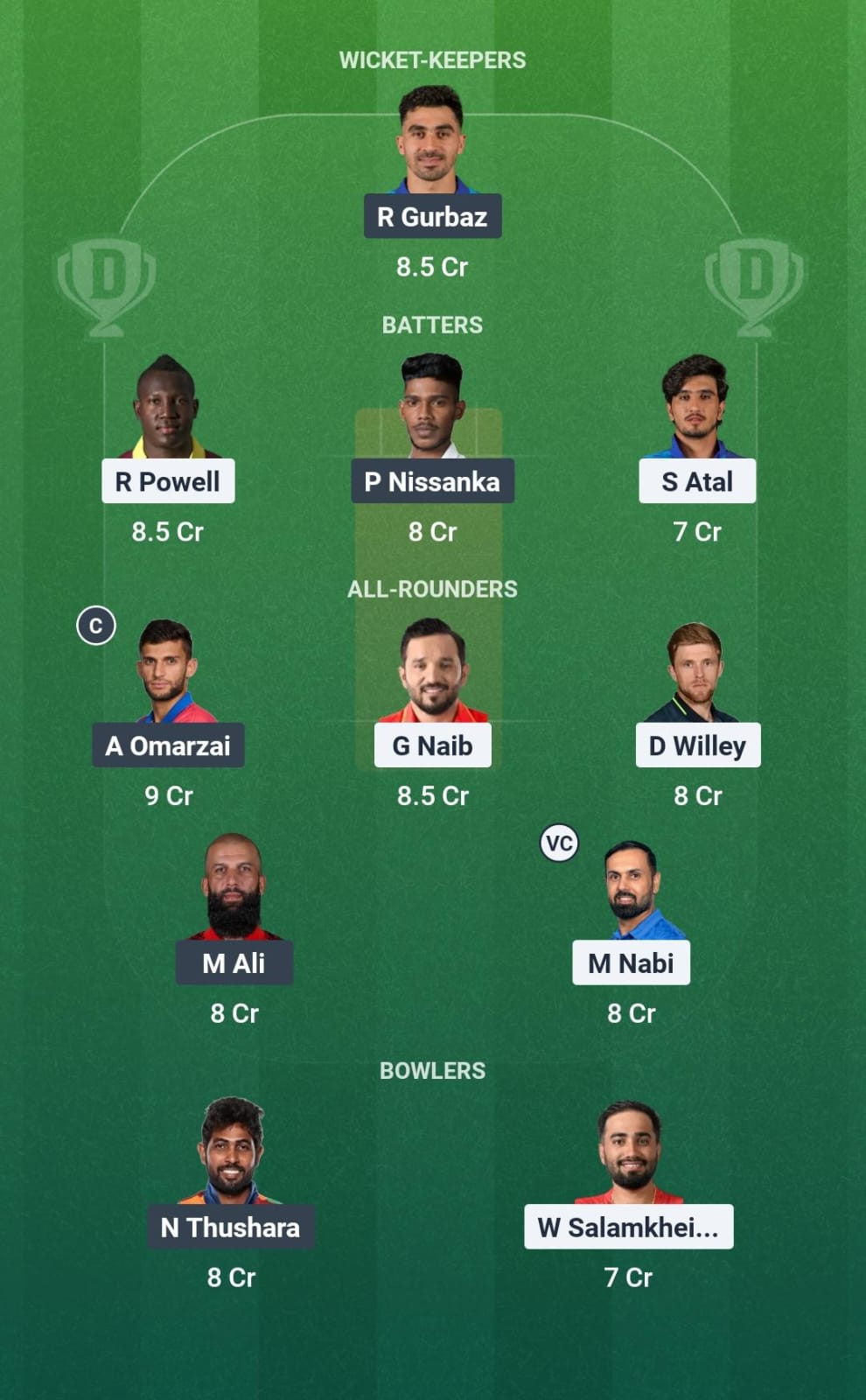 Rahmanullah Gurbaz, Sediqullah Atal, Pathum Nissanka, Moeen Ali, David Willey, Rovman Powell, Mohammad Nabi(VC), Gulbadin Naib, Azmatullah Omarzai(C), Nuwan Thushara, Waqar Salamkheil
