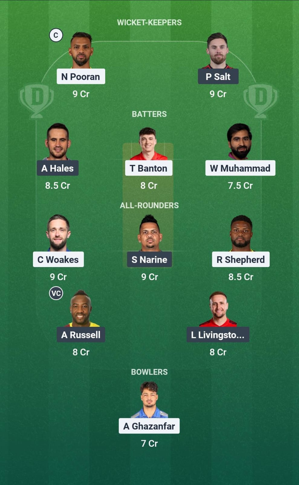Nicholas Pooran(C), Phil Salt, Tom Banton, Alex Hales, Muhammad Waseem, Liam Livingstone, Romario Shepherd, Andre Russell(VC), Chris Woakes, AM Ghazanfar, Sunil Narine