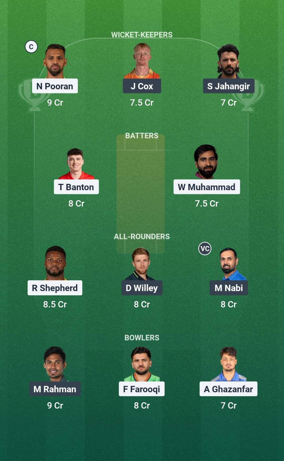 Muhammad Waseem, Tom Banton, Sanjay Krishnamurthi, Nicholas Pooran(wk), Kieron Pollard(c), Shakib Al Hasan, Romario Shepherd, Arab Gul Momand, Allah Ghazanfar, Zahoor Khan, Fazalhaq Farooqi