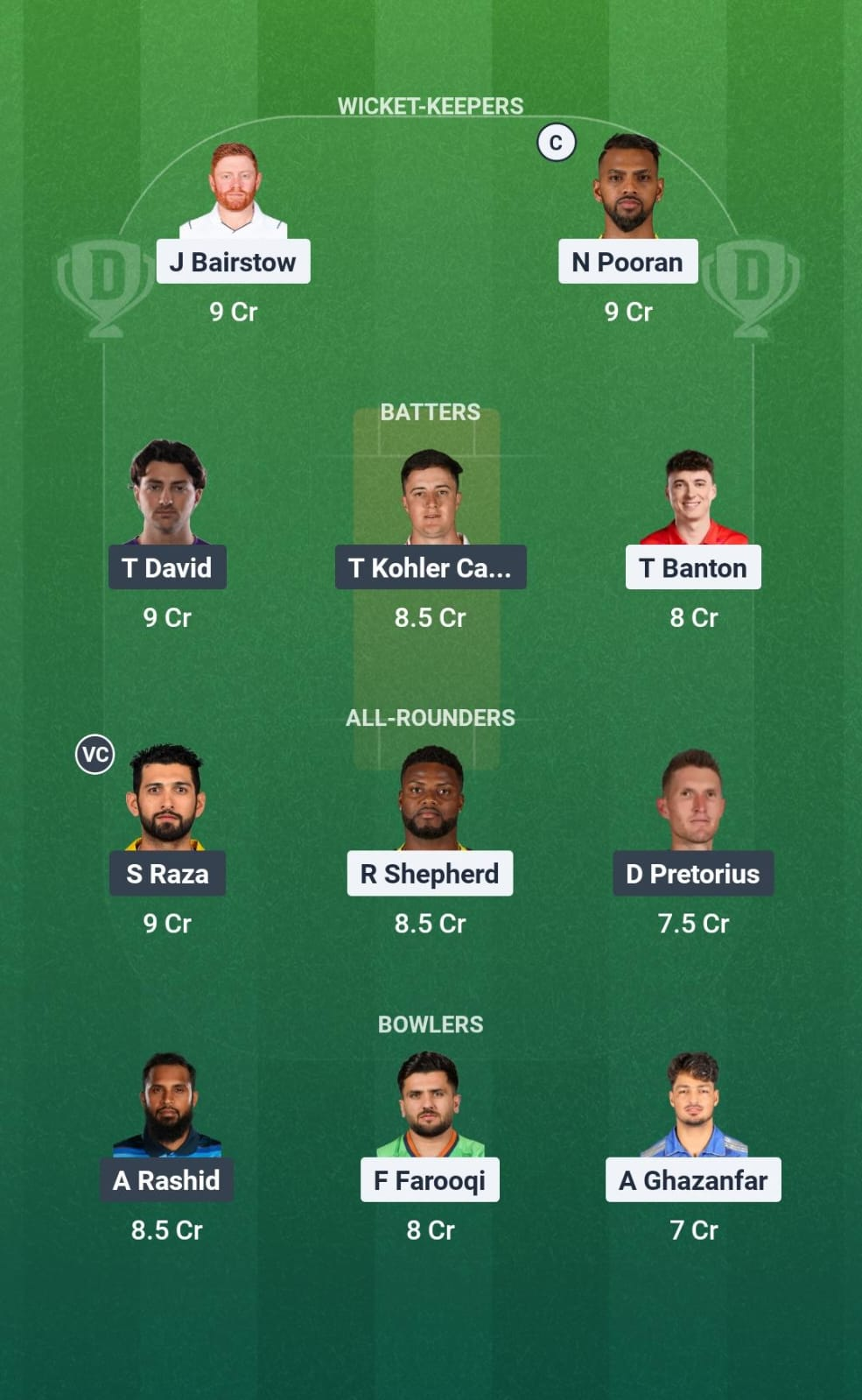 Jonny Bairstow, Nicholas Pooran(C), Tom Kohler-Cadmore, Tom Banton, Tim David, Romario Shepherd, Sikandar Raza(VC), AM Ghazanfar, Fazalhaq Farooqi, Adil Rashid, Junaid Siddique
