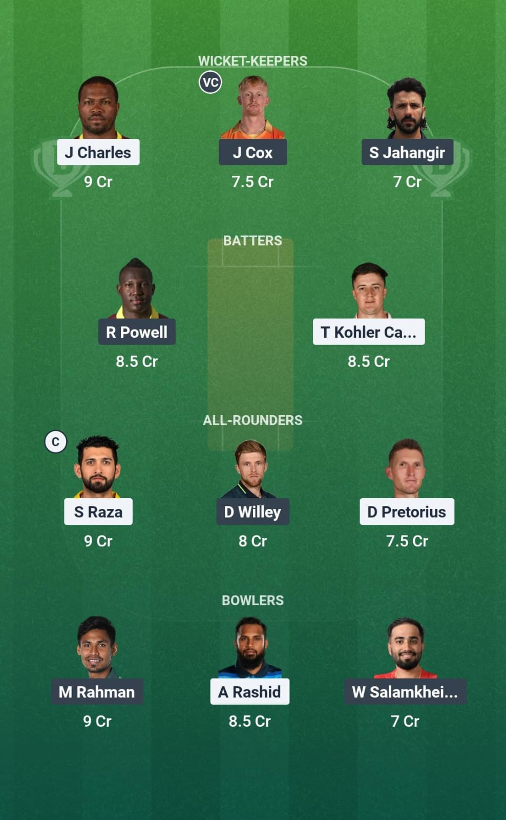 Johnson Charles, Shayan Jahangir, Tom Kohler-Cadmore, Jordan Cox(VC), Sikandar Raza(C), Rovmen Powell, David Willey, Dwaine Pretorius, Waqar Salamkheil, Adil Rashid, Mustafizur Rahman