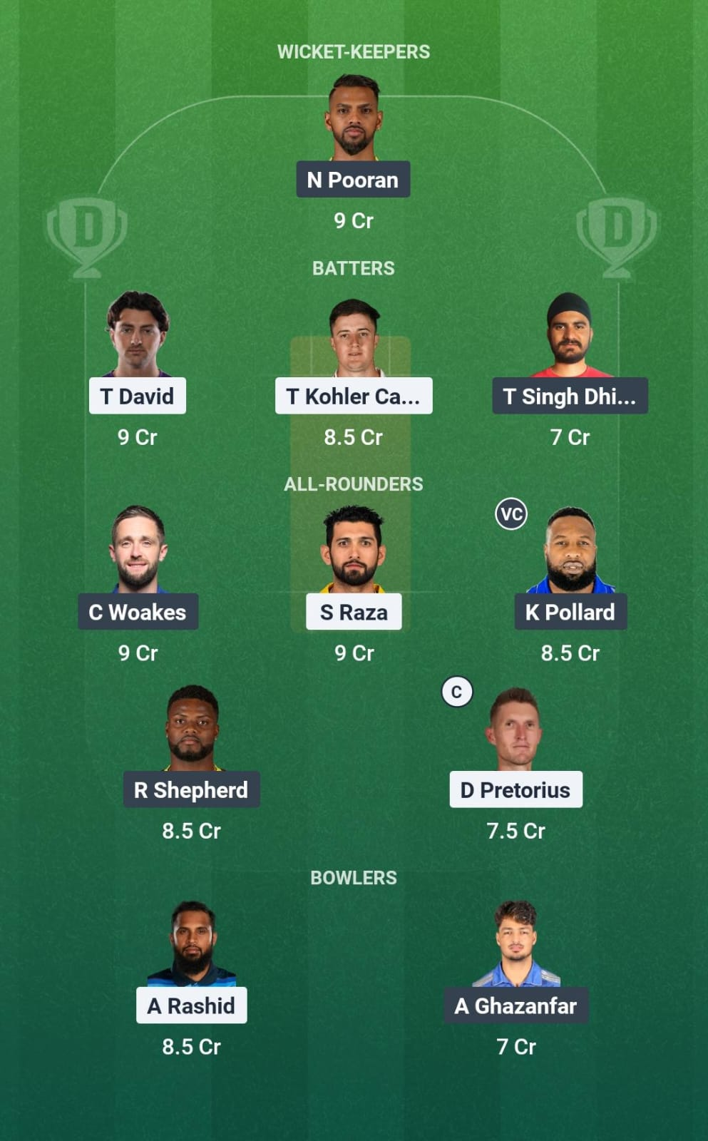 Nicholas Pooran, Tajinder Dhillon, Tom Kohler-Cadmore, Sikandar Raza, Romario Shepherd, Tim David, Dwaine Pretorius(C), Chris Woakes, Kieron Pollard(VC), Adil Rashid, AM Ghazanfar