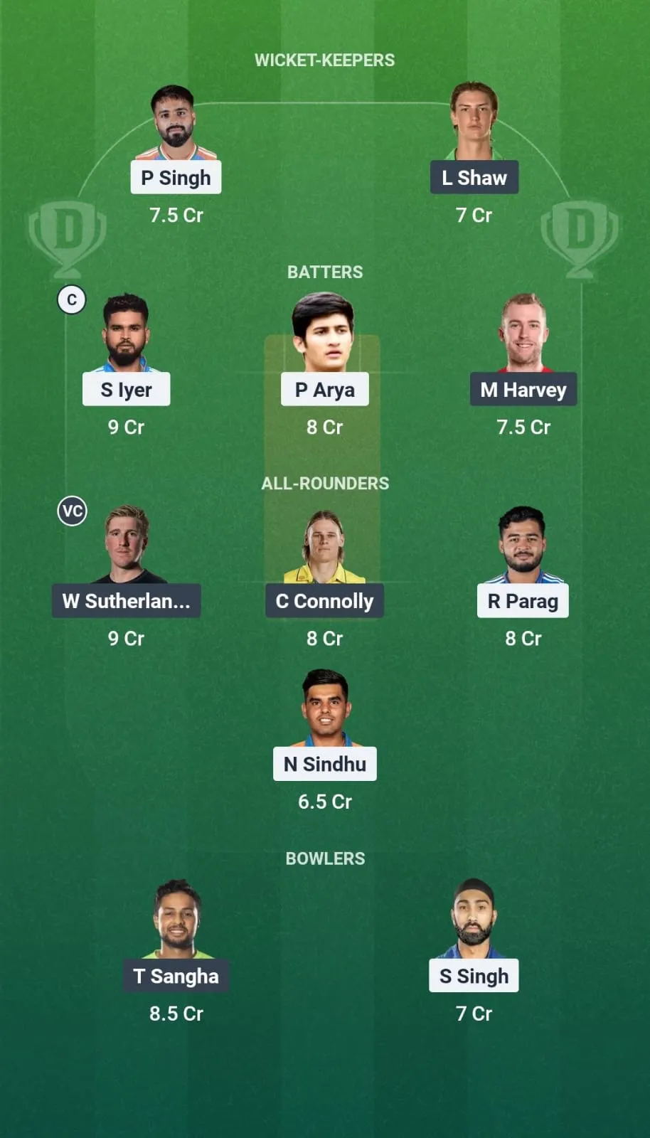 Priyansh Arya, Prabhsimran Singh(w), Shreyas Iyer(c), Riyan Parag, Ayush Badoni, Nishant Sindhu, Suryansh Shedge, Ravi Bishnoi, Simarjeet Singh, Gurjapneet Singh, Yudhvir Singh Charak