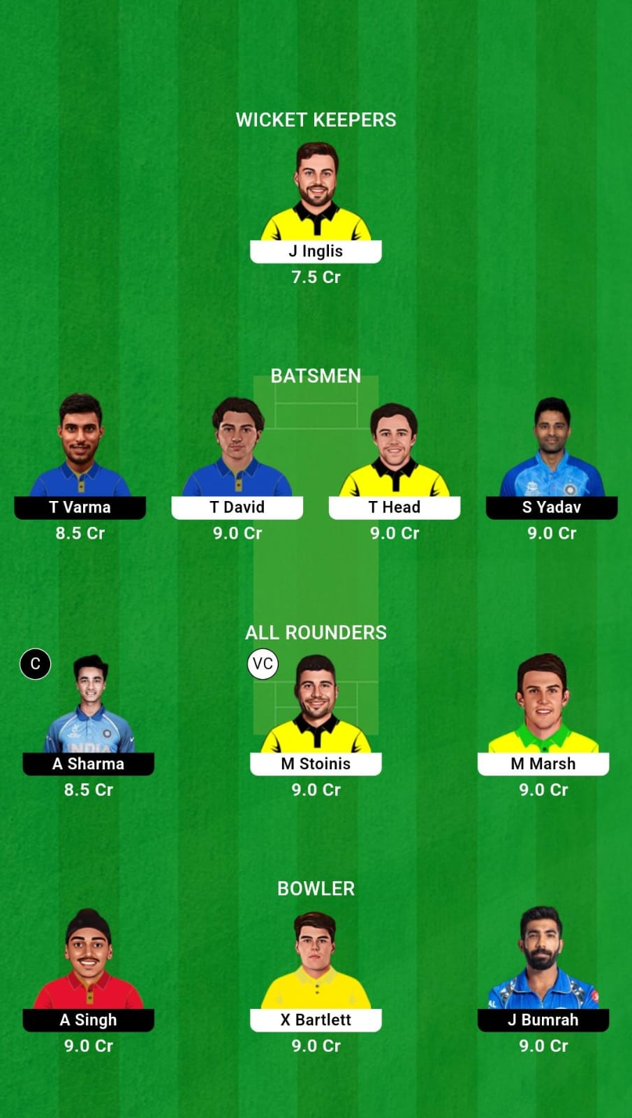 Josh Inglis, Tim David, Travis Head, Suryakumar Yadav, Tilak Varma, Marcus Stoinis(VC), Mitchell Marsh, Abhishek Sharma(C), Xavier Bartlett, Arshdeep Singh, Jasprit Bumrah