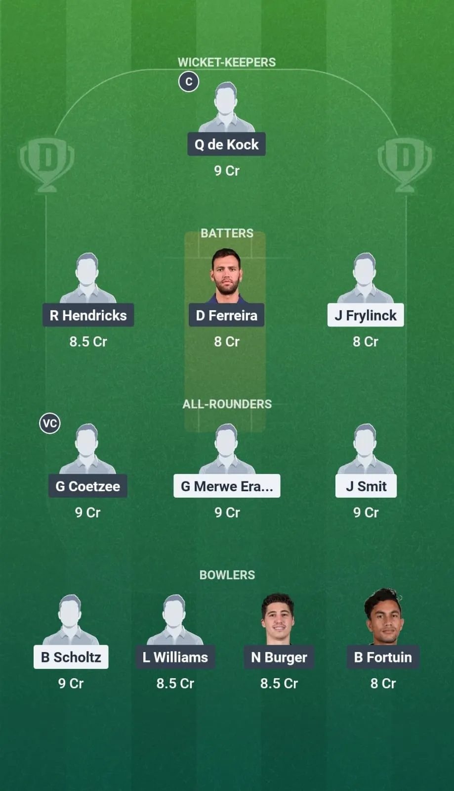 Donovan Ferreira (c), Reeza Hendricks, Quinton de Kock, Lhuan Dre Pretorius, Jason Smith, Rubin Hermann, Nandre Burger, Kwena Maphaka, Lizaad Williams, Bjorn Fortuin, Nqaba Peter