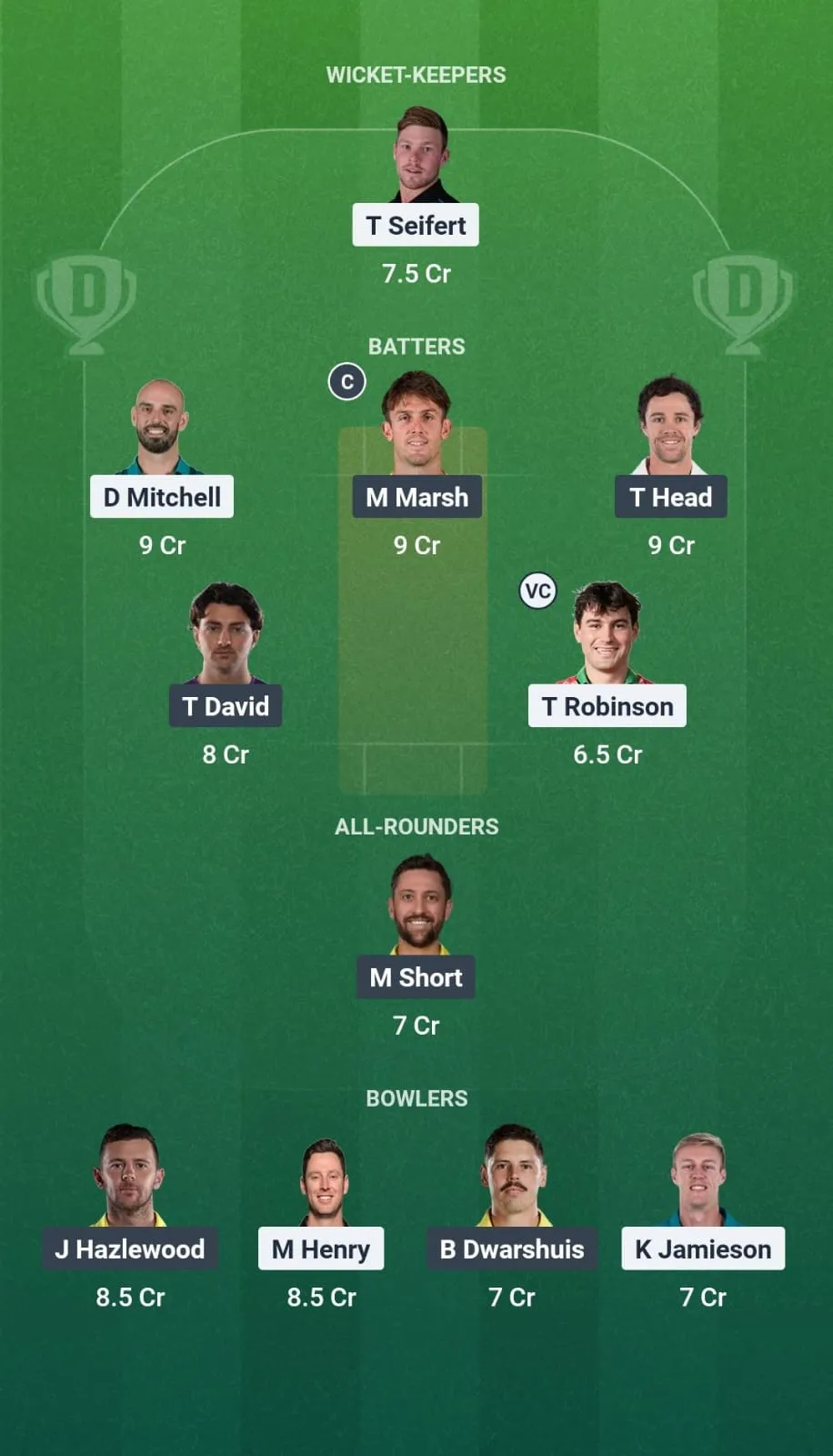 Tim Seifert, Tim Robinson(VC), Mitchell Marsh(C), Travis Head, Tim David, Daryl Mitchell, Matthew Short, Kyle Jamieson, Matt Henry, Ben Dwarshuis, Josh Hazlewood