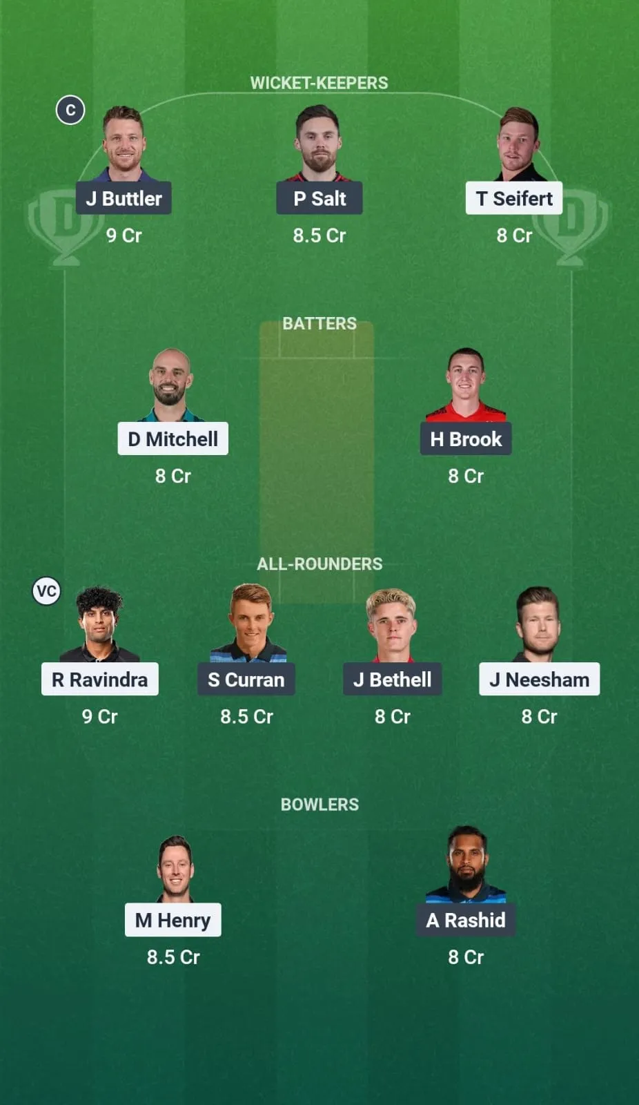 Phil Salt, Jos Buttler(C), Tim Seifert, Daryl Mitchell, Harry Brook, Sam Curran, Rachin Ravindra(VC), James Neesham, Jacob Bethell, Adil Rashid, Matt Henry