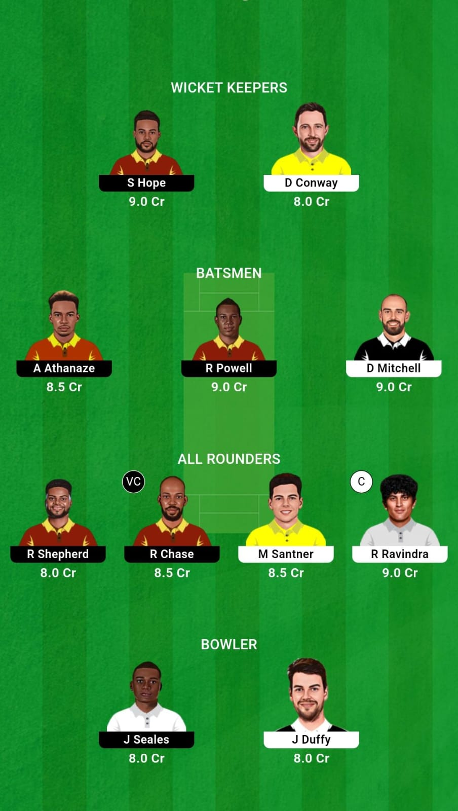 Shai Hope, Devon Conway, Alick Athanaze, Daryl Mitchell, Rovman Powell, Roston Chase(VC), Rachin Ravindra(C), Mitchell Santner, Romario Shepherd, Jayden Seales, Jacob Duffy