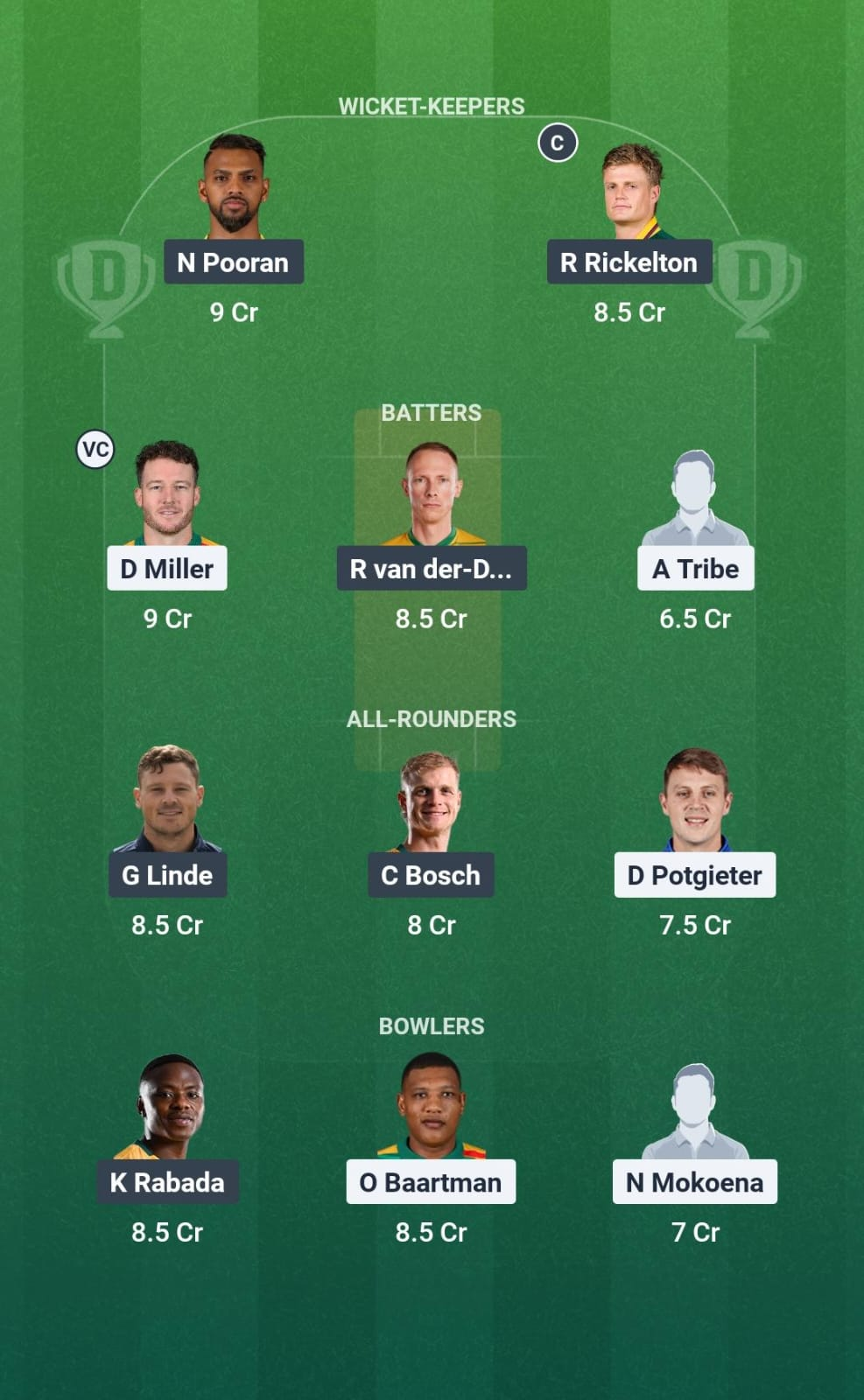 Nicholas Pooran, Ryan Rickelton(C), Asa Tribe, Rassie van der Dussen, David Miller(VC), George Linde, Corbin Bosch, Delano Potgieter, Kagiso Rabada, Nqobani Mokoena, Ottneil Baartman