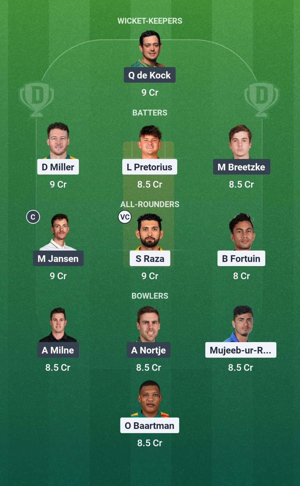 Lhuan-dre Pretorius, Dan Lawrence, Rubin Hermann, David Miller (C), Sikandar Raza, Delano Potgieter, Kyle Verreynne (WK), Bjorn Fortuin, Mujeeb-ur-Rahman, Gudakesh Motie, Ottneil Baartman