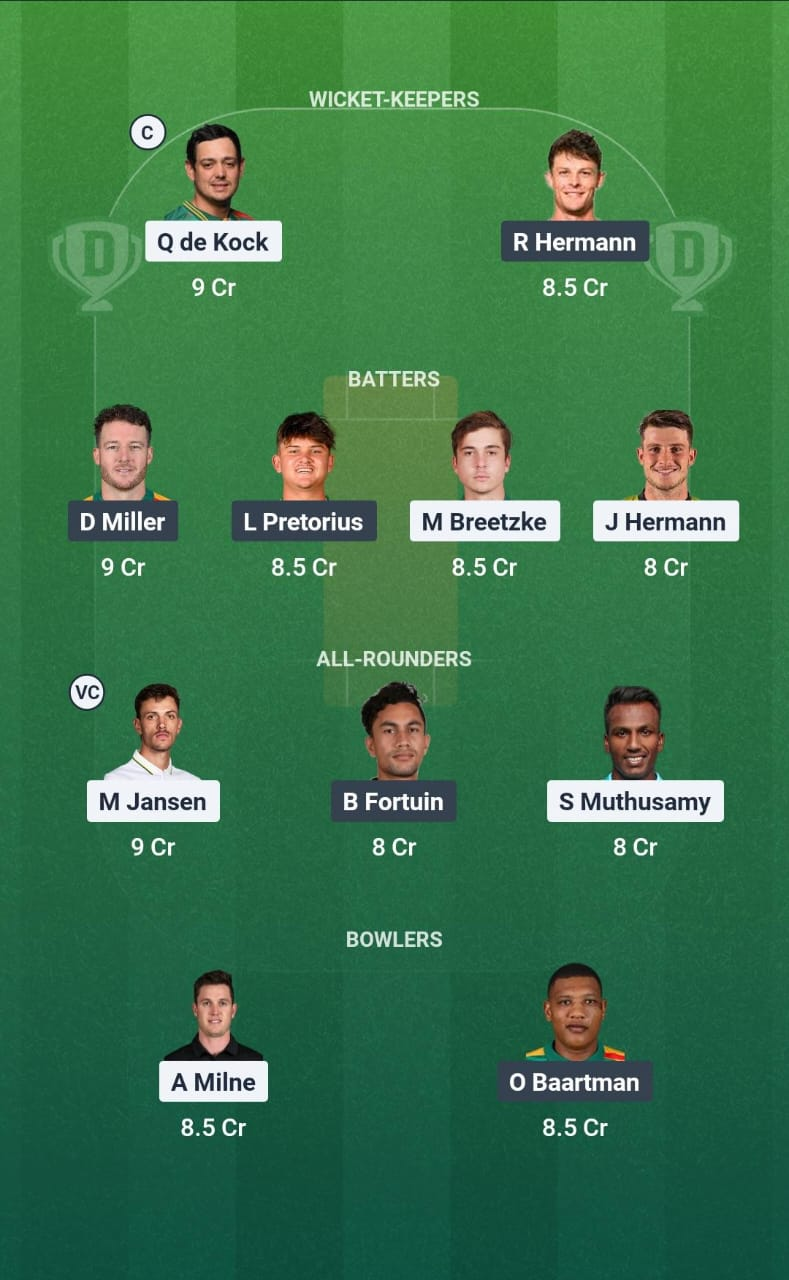 Quinton de Kock(C), Rubin Hermann, Matthew Breetzke, David Miller, Lhuan-dre Pretorius, Jordan Hermann, Marco Jansen(VC), Bjorn Fortuin, Senuran Muthusamy, Ottneil Baartman, Adam Milne