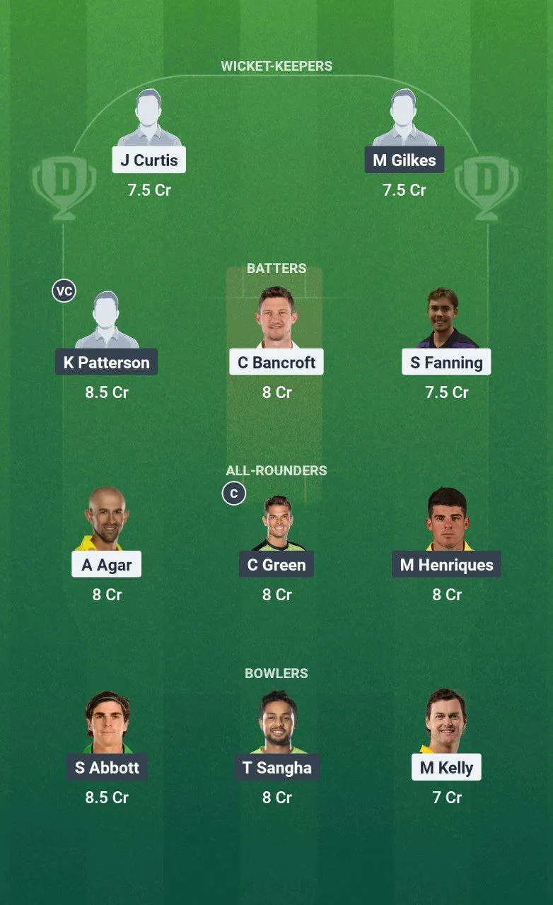 1. Blake Nikitaras, 2. Kurtis Patterson, 3. Matthew Gilkes, 4. Oliver Davies, 5. Moises Henriques/Moises Henriques, 6. Liam Hatcher/Lachlan Shaw(WK), 7. Chris Green/Sean Abbott(C), 8. Ben Dwarshuis, 9. Tanveer Sangha/Kyle Abbott(C), 10. Tanveer Sangha, 11. Ryan Hadley