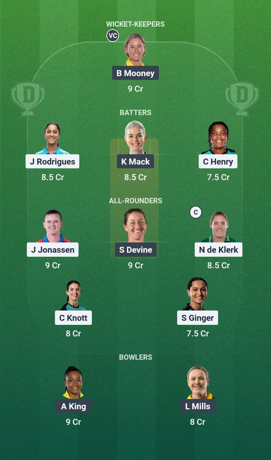 Beth Mooney(VC), Katie Mack, Jemimah Rodrigues, Chinelle Henry, Jess Jonassen, Charli Knott, Nadine de Klerk(C), Sophie Devine, Lilly Mills, Alana King, Sianna Ginger