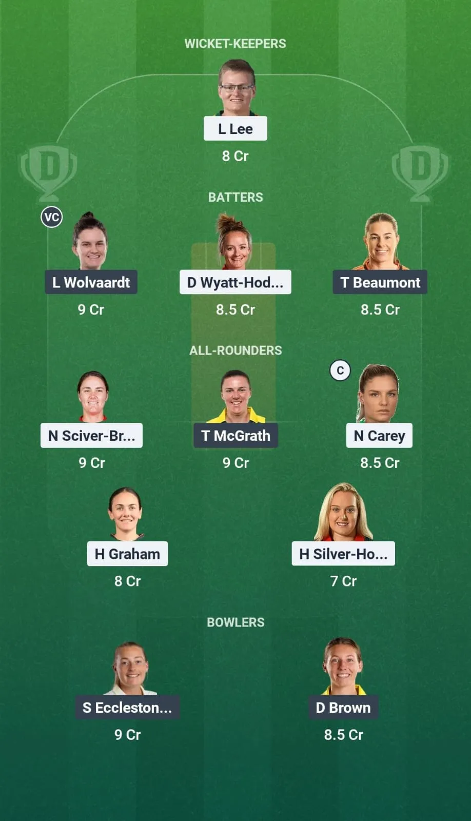 Lizelle Lee, Danielle Wyatt-Hodge, Laura Wolvaardt(VC), Tammy Beaumont, Nat Sciver-Brunt, Tahlia McGrath, Nicola Carey(C), Heather Graham, Hayley Silver-Holmes, Sophie Ecclestone, Darcie Brown