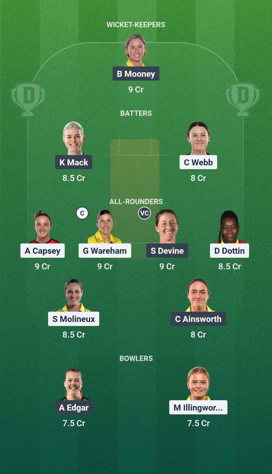 Beth Mooney, Katie Mack, Sophie Devine(VC), Courtney Webb, Alice Capsey, Georgia Wareham(C), Deandra Dottin, Sophie Molineux, Chloe Ainsworth, Amy Edgar, Milly Illingworth