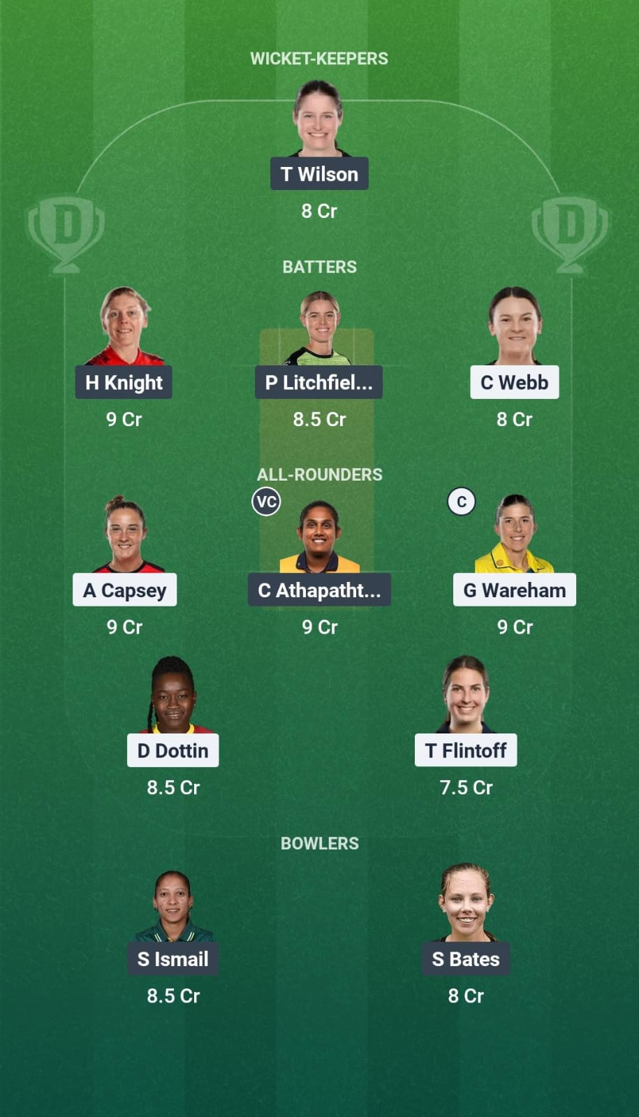 Phoebe Litchfield (c), Tahlia Wilson (wk), Georgia Voll, Heather Knight, Chamari Athapaththu, Laura Harris, Anika Learoyd, Hasrat Gill, Taneale Peschel, Shabnim Ismail, Samantha Bates