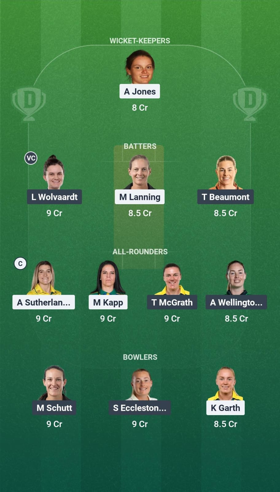 Sophie Reid, Meg Lanning, Tammy Beaumont, Laura Wolvaardt(VC), Annabel Sutherland(C), Marizanne Kapp, Tahlia McGrath, Amanda-Jade Wellington, Kim Garth, Megan Schutt, Anesu Mushangwe