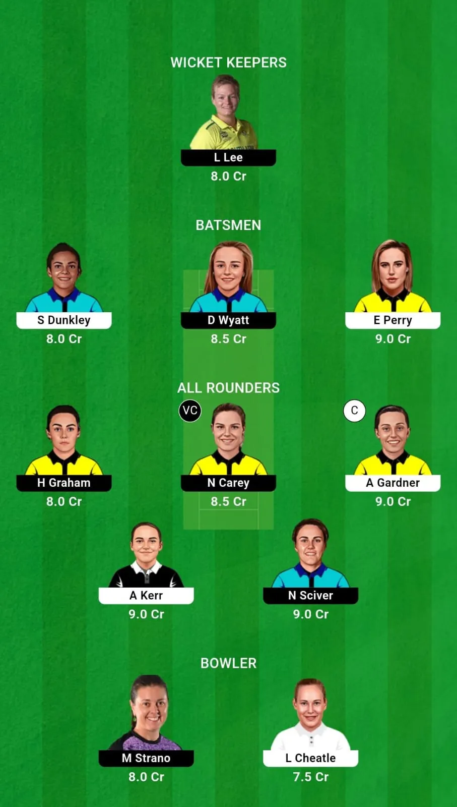 Lizelle Lee, Danielle Wyatt-Hodge, Ellyse Perry, Sophia Dunkley, Nat Sciver-Brunt, Amelia Kerr, Nicola Carey(VC), Ashleigh Gardner(C), Heather Graham, Lauren Smith, Maitlan Brown