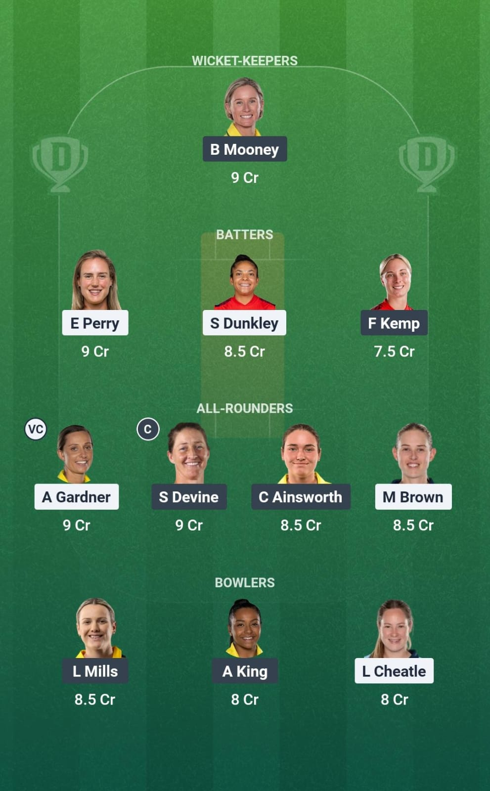 Ellyse Perry, Sophia Dunkley, Alyssa Healy(wk), Ashleigh Gardner(c), Amelia Kerr, Maitlan Brown, Mady Villiers, Erin Burns, Emma Manix-Geeves, Caoimhe Bray, Lauren Cheatle