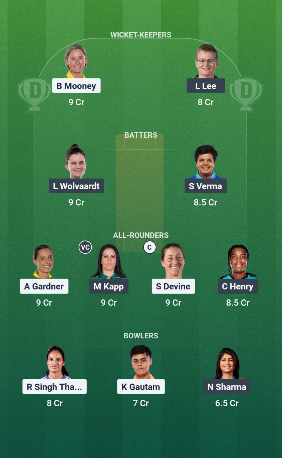 Beth Mooney, Lizelle Lee, Laura Wolvaardt, Shafali Verma, Marizanne Kapp(VC), Ashleigh Gardner, Sophie Devine(C), Chinelle Henry, Renuka Singh Thakur, Kashvee Gautam, Nandni Sharma