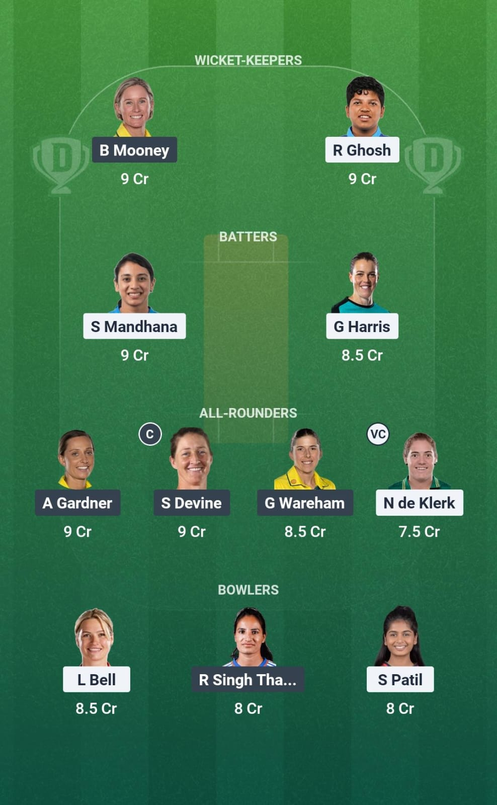Beth Mooney, Richa Ghosh, Sophie Devine(C), Grace Harris, Smriti Mandhana, Ashleigh Gardner, Georgia Wareham, Nadine de Klerk(VC), Shreyanka Patil, Renuka Singh Thakur, Lauren Bell