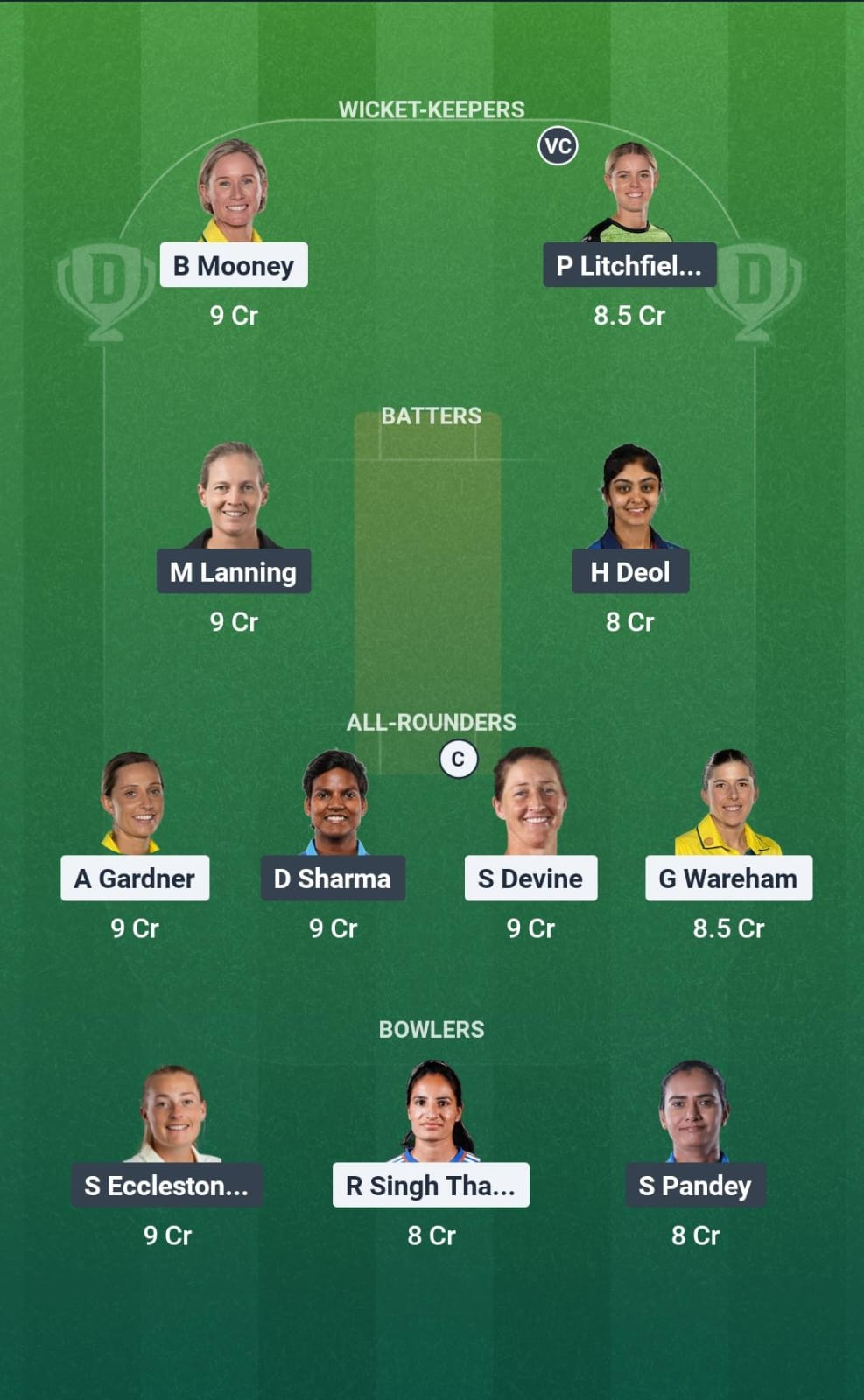 Beth Mooney, Phoebe Litchfield(VC), Harleen Deol, Sophie Devine(C), Meg Lanning, Ashleigh Gardner, Deepti Sharma, Georgia Wareham, Sophie Ecclestone, Shikha Pandey, Renuka Singh Thakur